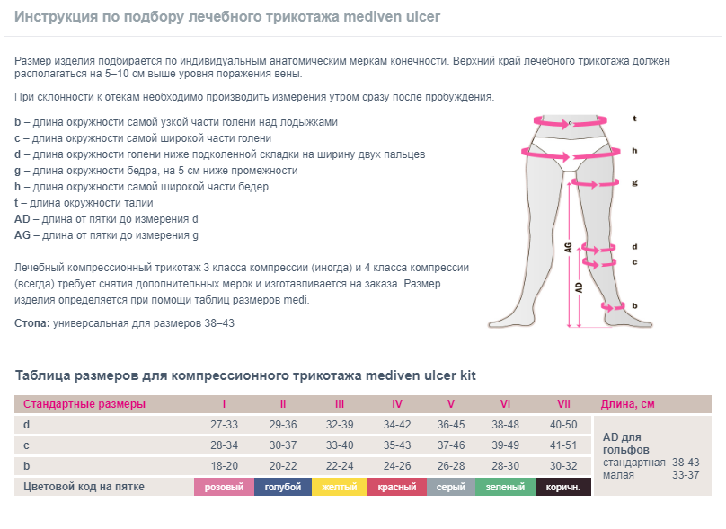 Первый гольф - mediven ulcer (в наборе – 2 шт.) с давлением 20 мм рт. ст. на уровне лодыжек обеспечивает умеренную круглосуточную компрессию, которая хорошо переносится пациентами в течение 24 часов. Второй гольф - mediven ulcer plus (в наборе – 1 шт.), также с давлением 20 мм рт. ст., надевается поверх гольфа mediven ulcer и используется в течение дня в период двигательной активности пациента. При этом уровень давления покоя в области лодыжек возрастает до 40 мм рт. ст. Такое давление является оптимальным для профилактики и лечения трофических язв. В то же время, увеличивающаяся поверхностная жесткость материалов обеспечивает высокое рабочее давление. Круглосуточная градуированная компрессия с дифференцированным подходом: в ночное время – 20 мм рт. ст.; в дневное время – 40 мм рт. ст. и выше. 7 размеров (по окружности надлодыжечной области), две длины – стандартная и малая