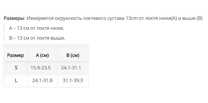 Размеры: Измеряется окружность локтевого сустава 13cm от локтя ниже(A) и выше (B)